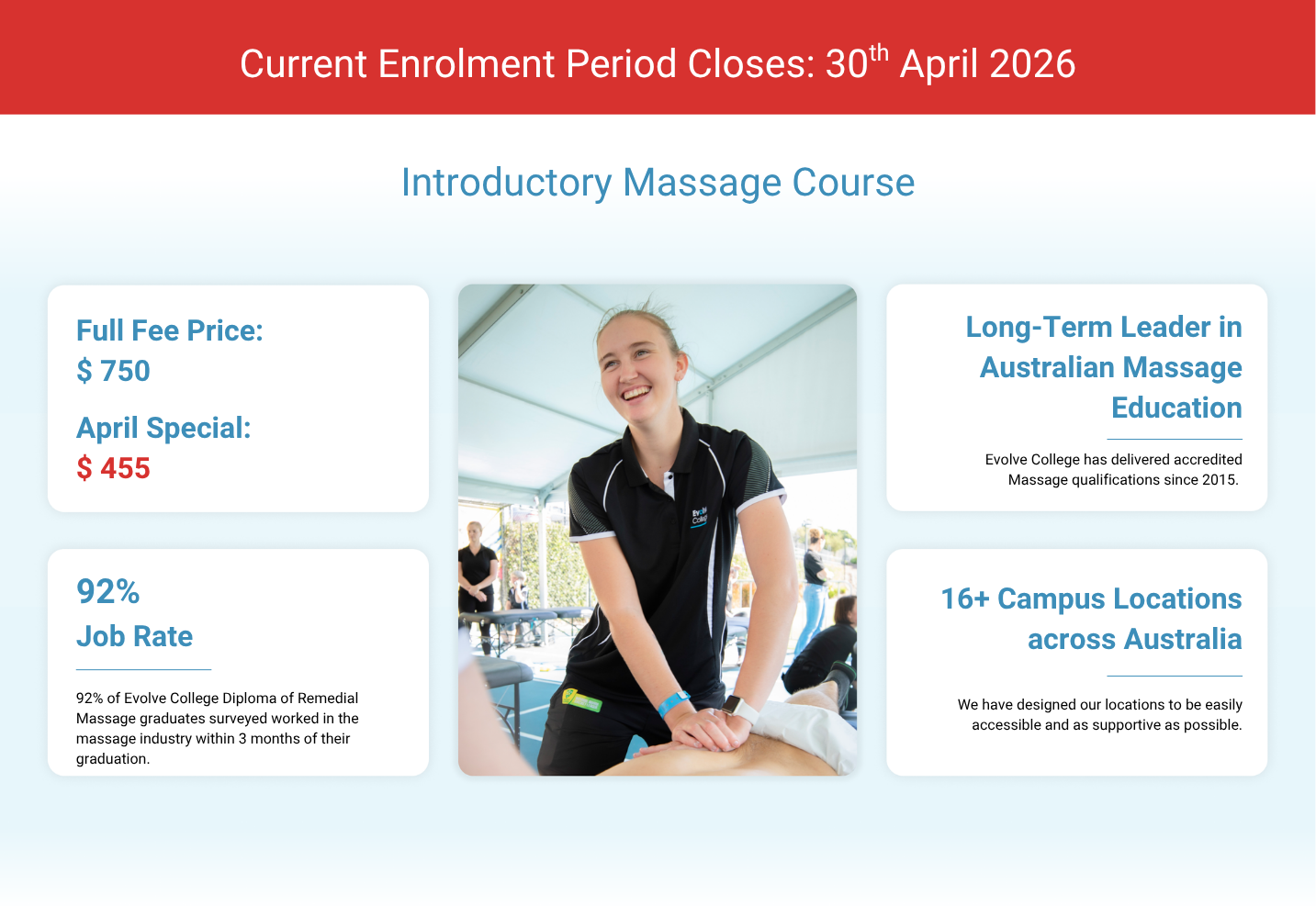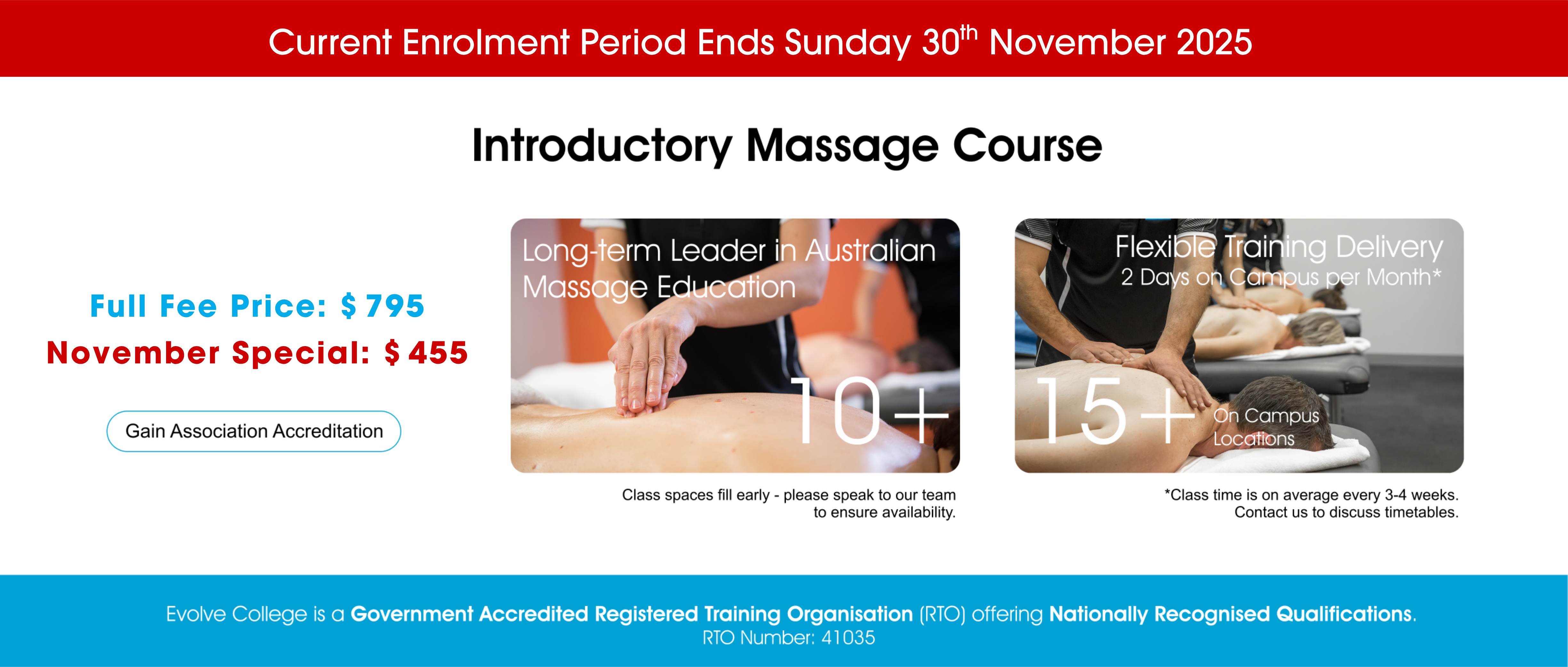 The Introductory Massage Course is a 2 day - full weekend (or weekday) course that teaches you many of the fundamental principles of massage, with the professionalism and high standards set by Evolve College.