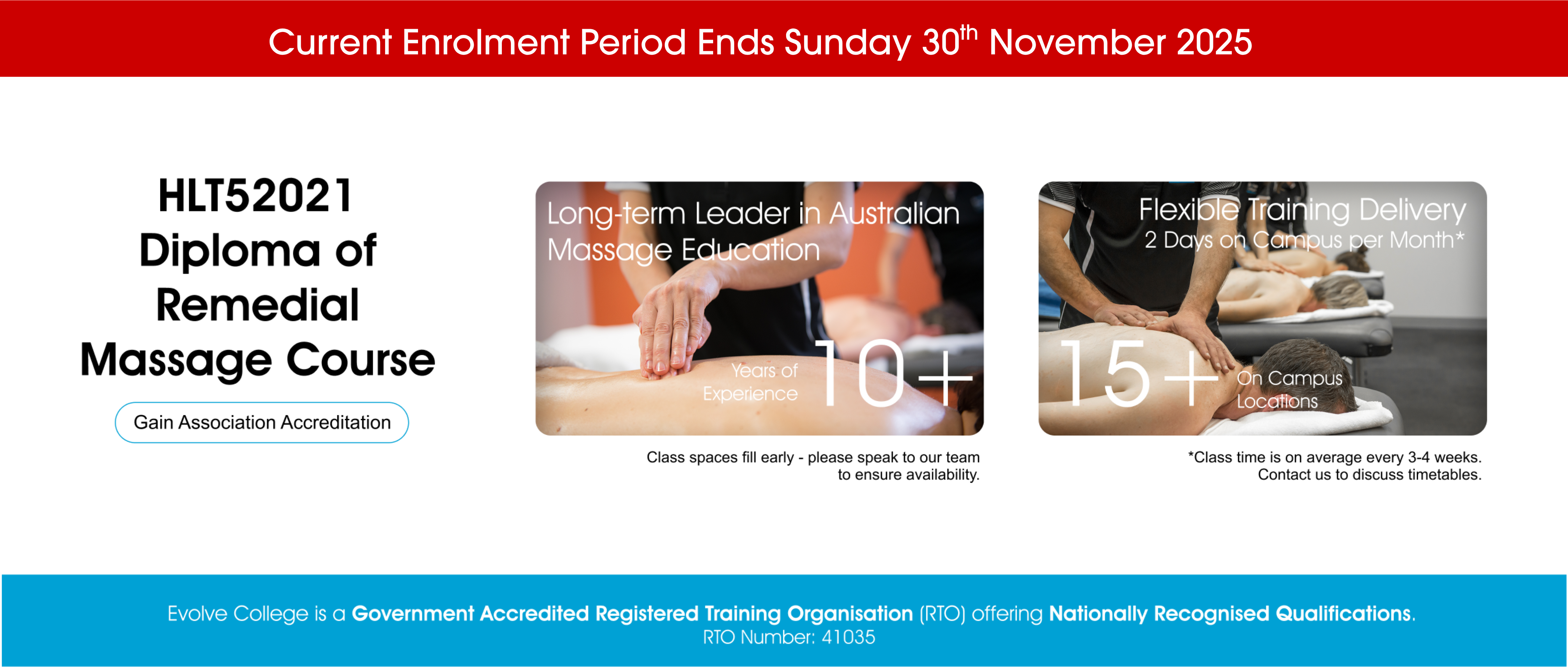 Evolve College offers flexible massage courses for Canberra and surrounds. Study the Diploma of Remedial Massage course with Evolve College and experience a massage school with a focus on integrity and quality.
