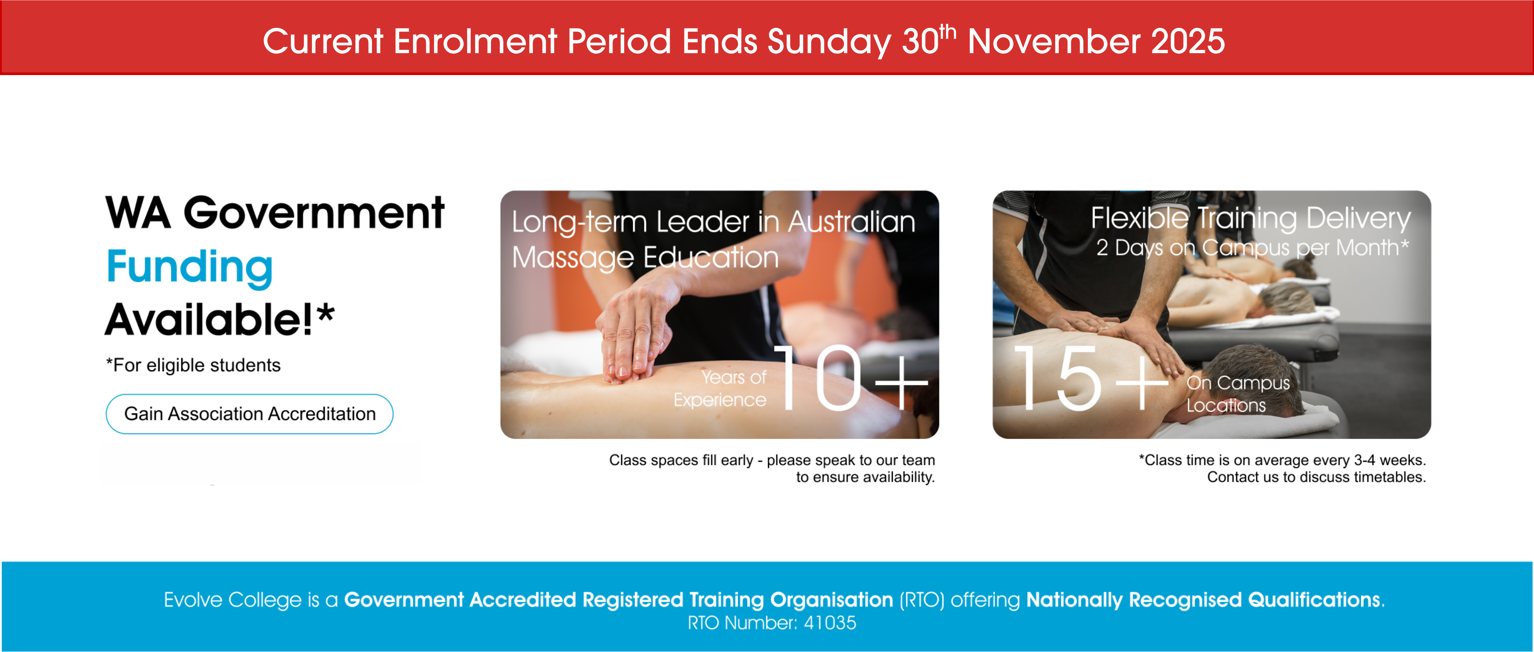 Eligible Western Australian residents may enrol into the HLT52021 Diploma of Remedial Massage course through the Lower Fees, Local Skills program. This program is run through the Western Australia Government. Evolve College is approved to offer funding available under the Priority Industry Training Program to existing workers residing in Western Australia.