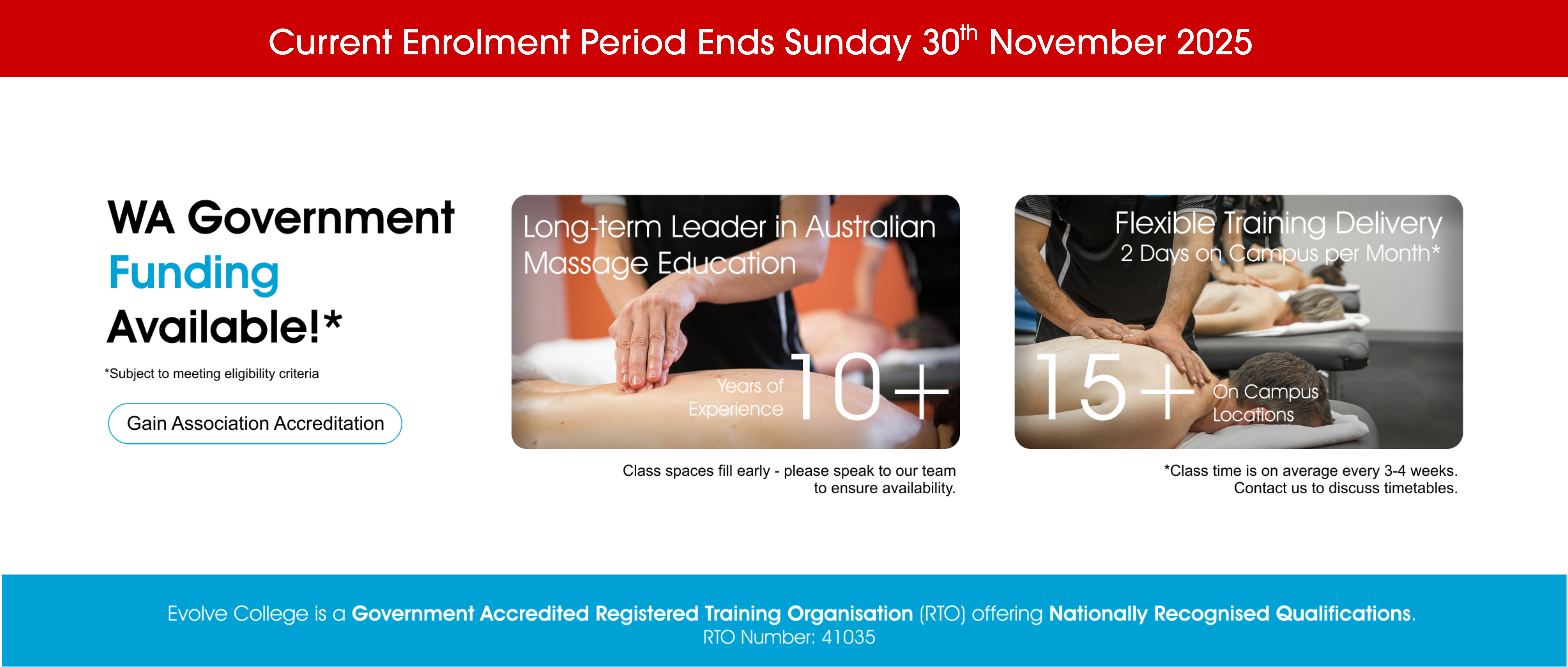 Eligible Western Australian residents may enrol into the HLT52021 Diploma of Remedial Massage course through the Lower Fees, Local Skills program. This program is run through the Western Australia Government. Evolve College is approved to offer subsidised enrolments under the Priority Industry Training Program to elegible workers residing in Western Australia.