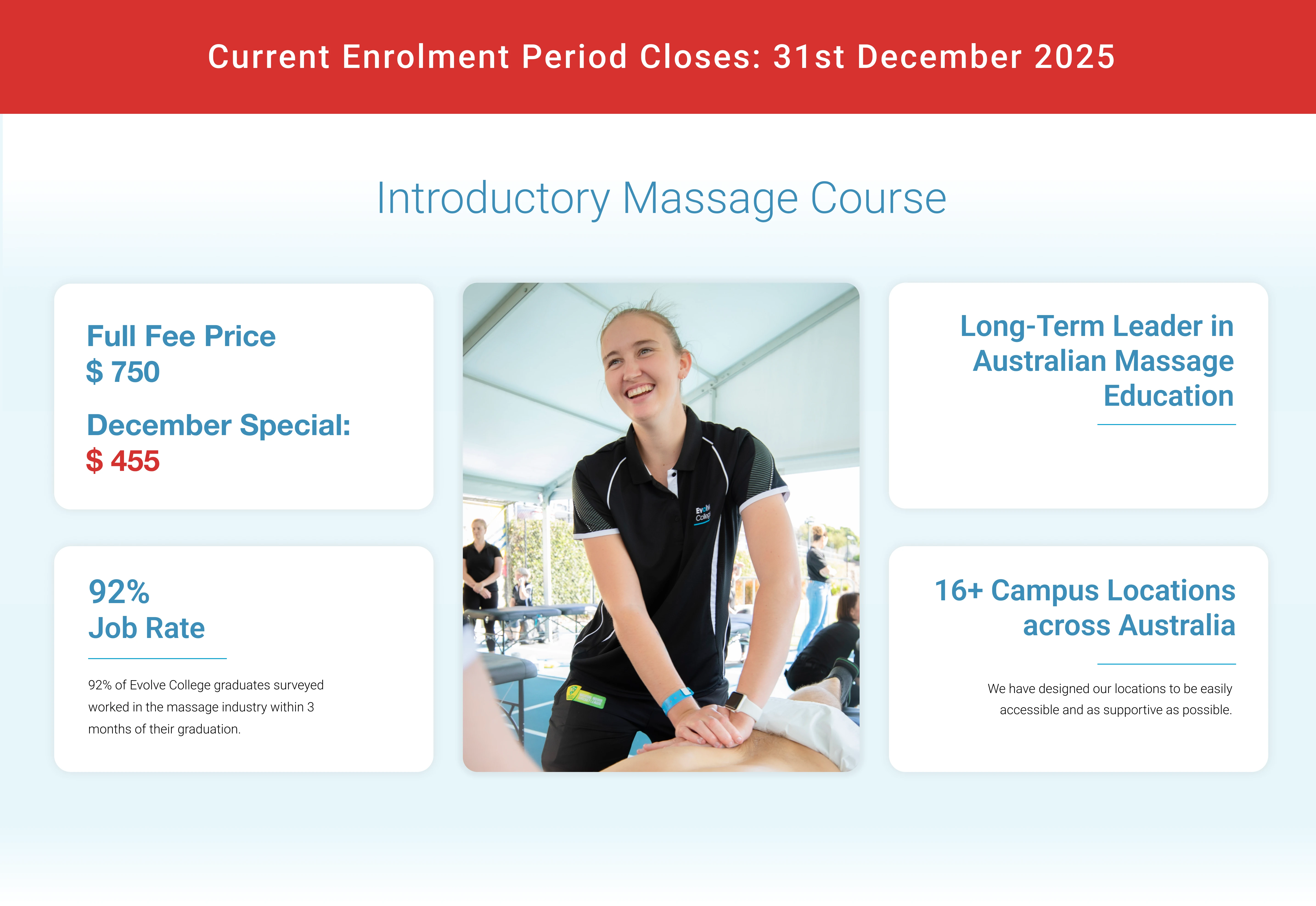 The Introductory Massage Course is a 2 day - full weekend (or weekday) course that teaches you many of the fundamental principles of massage, with the professionalism and high standards set by Evolve College.