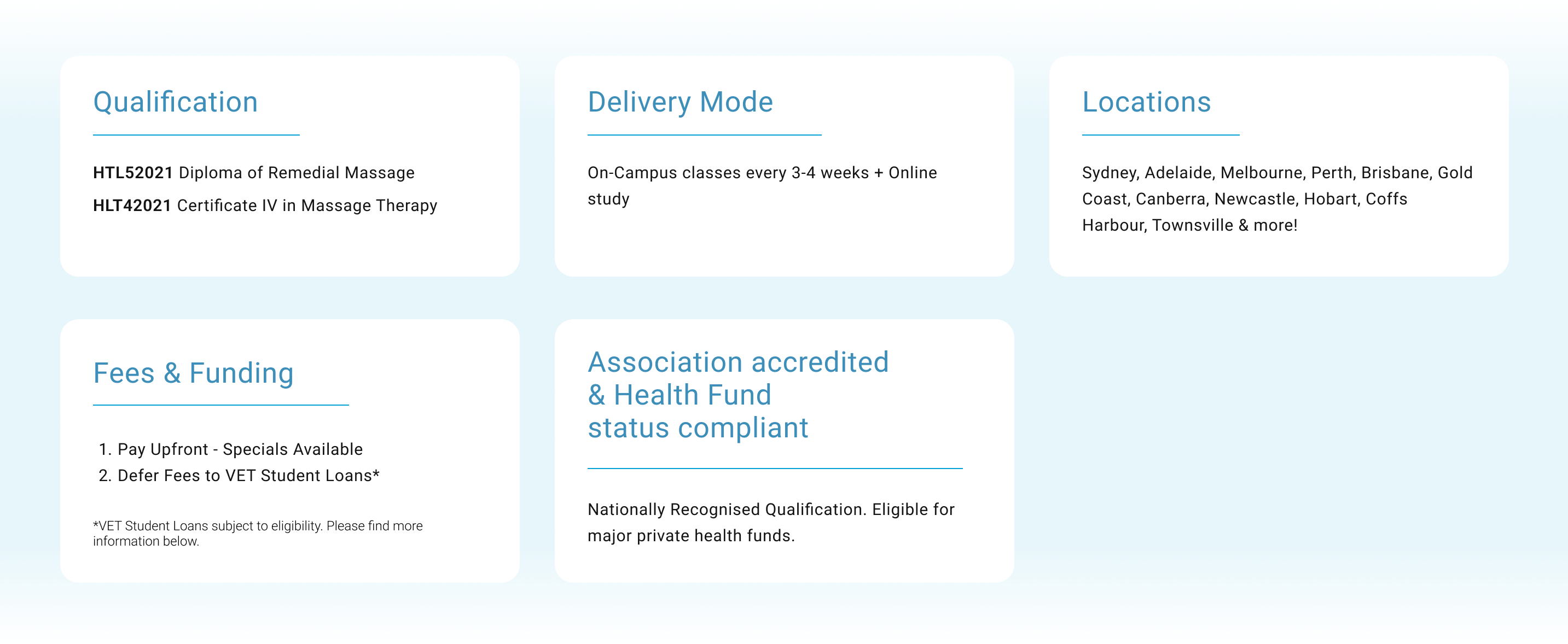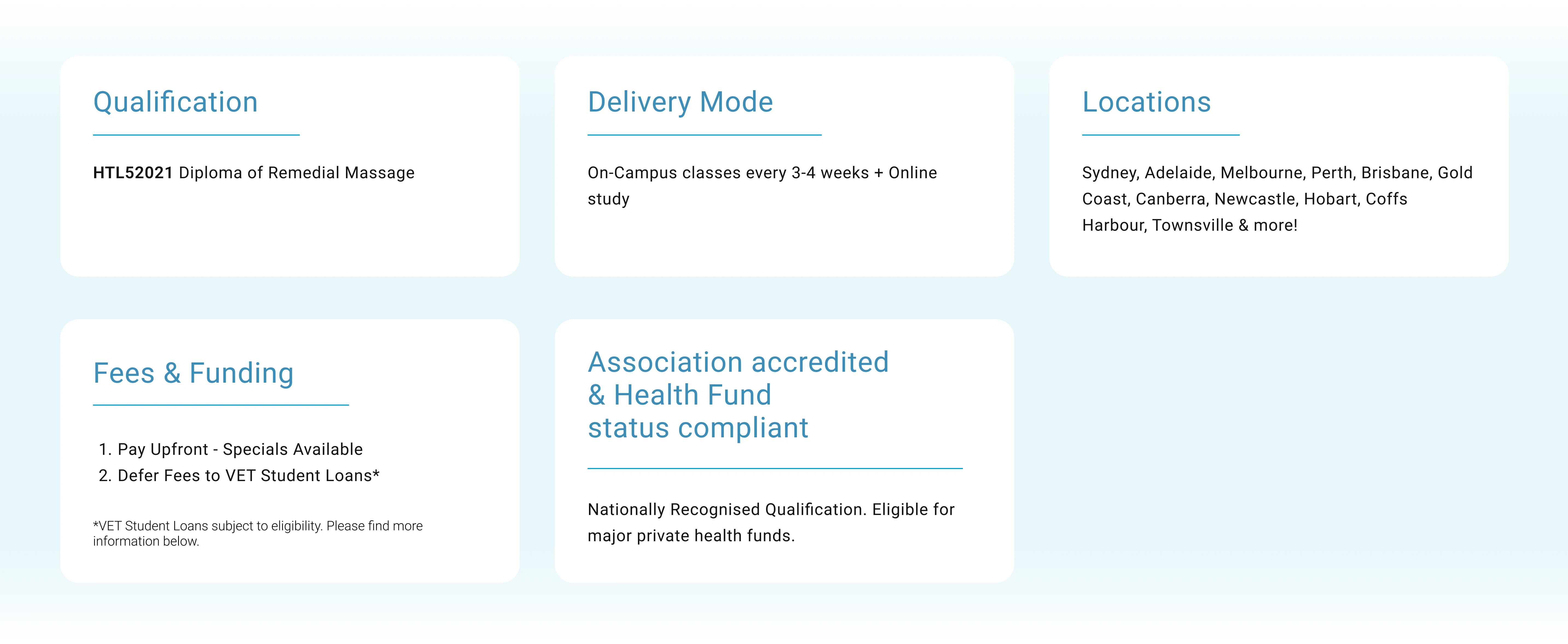 For this Diploma of Remedial Massage you can Pay Upfront or through a VET Student Loan options available. To see if you are eligible for a VET Student Loan please speak to our team.
