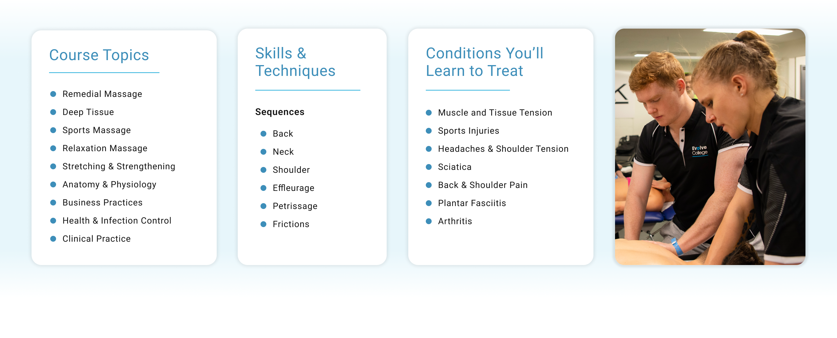 Being the largest private provider of massage education in Australia, Evolve College is a focused leader in the massage industry that educates with a commitment to ethical clinical practices and preparation for remedial massage services.