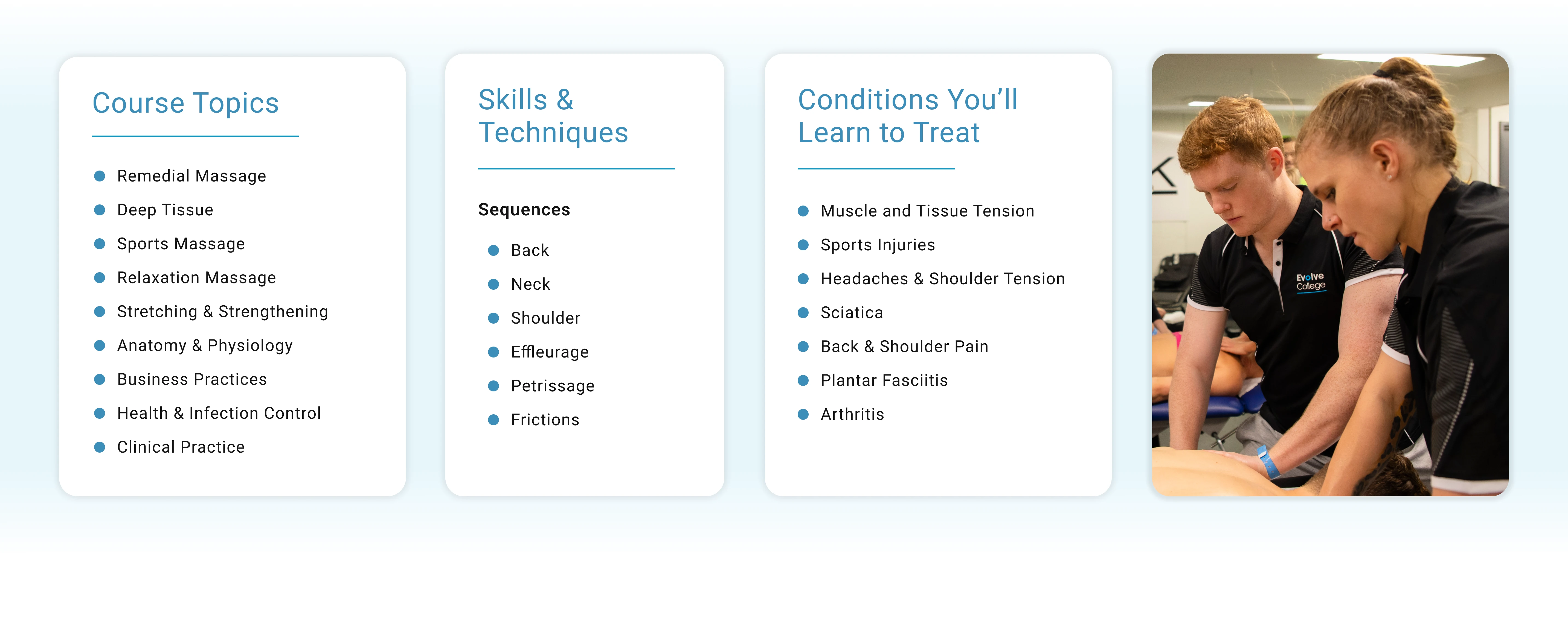 Evolve College offers flexible massage courses for Coffs Harbour and surrounds. Study the Diploma of Remedial Massage course with Evolve College and experience a massage school with a focus on integrity and quality.