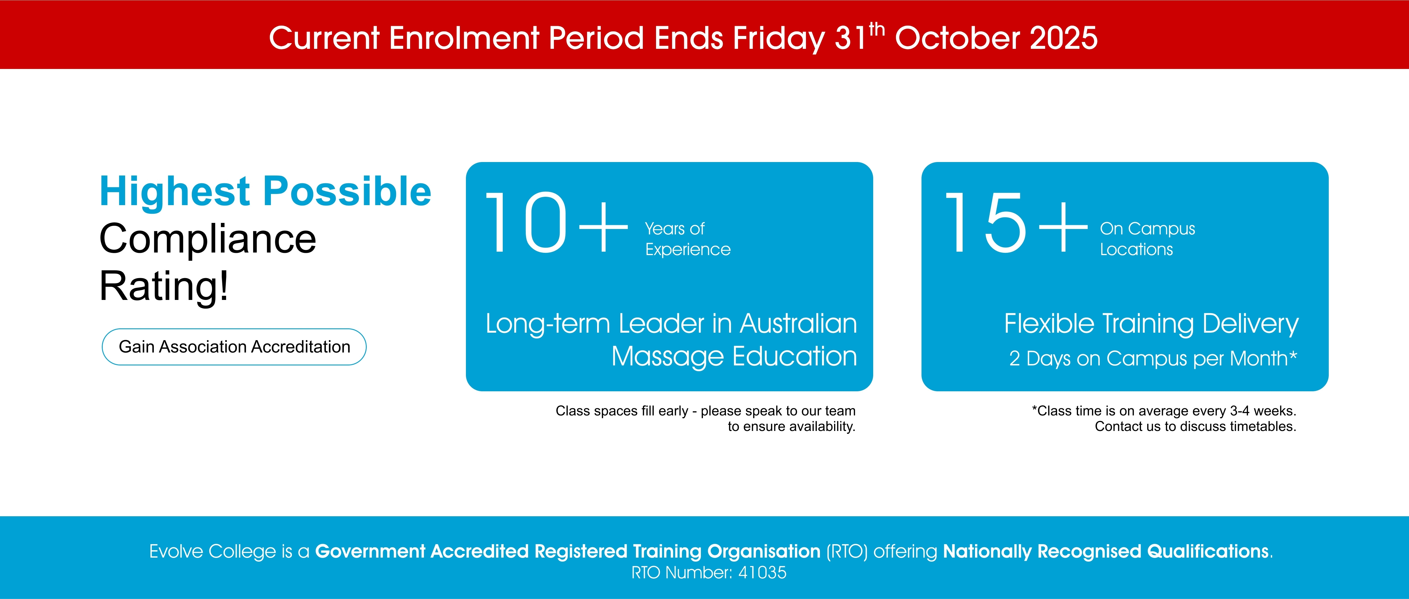 Evolve College offers two Vocational Education and Training (VET) massage courses that are Government accredited and nationally recognised qualifications as well as having multiple association accreditations. This provides all accreditation for you to start your professional career as a massage therapist.