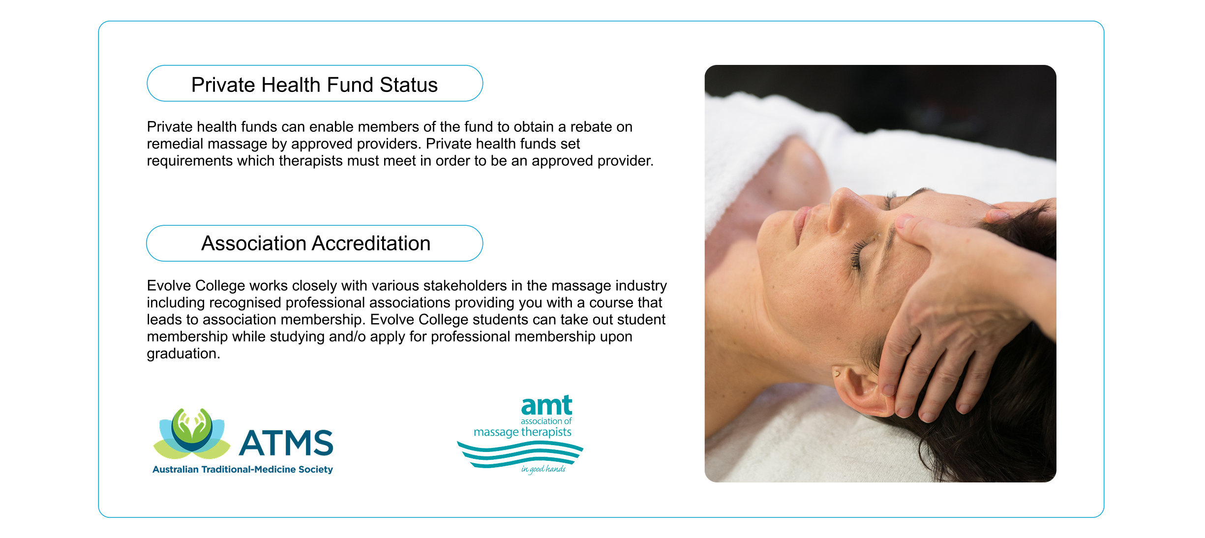 Evolve College offers two Vocational Education and Training (VET) massage courses that are Government accredited and nationally recognised qualifications as well as having multiple association accreditations. This provides all accreditation for you to start your professional career as a massage therapist.