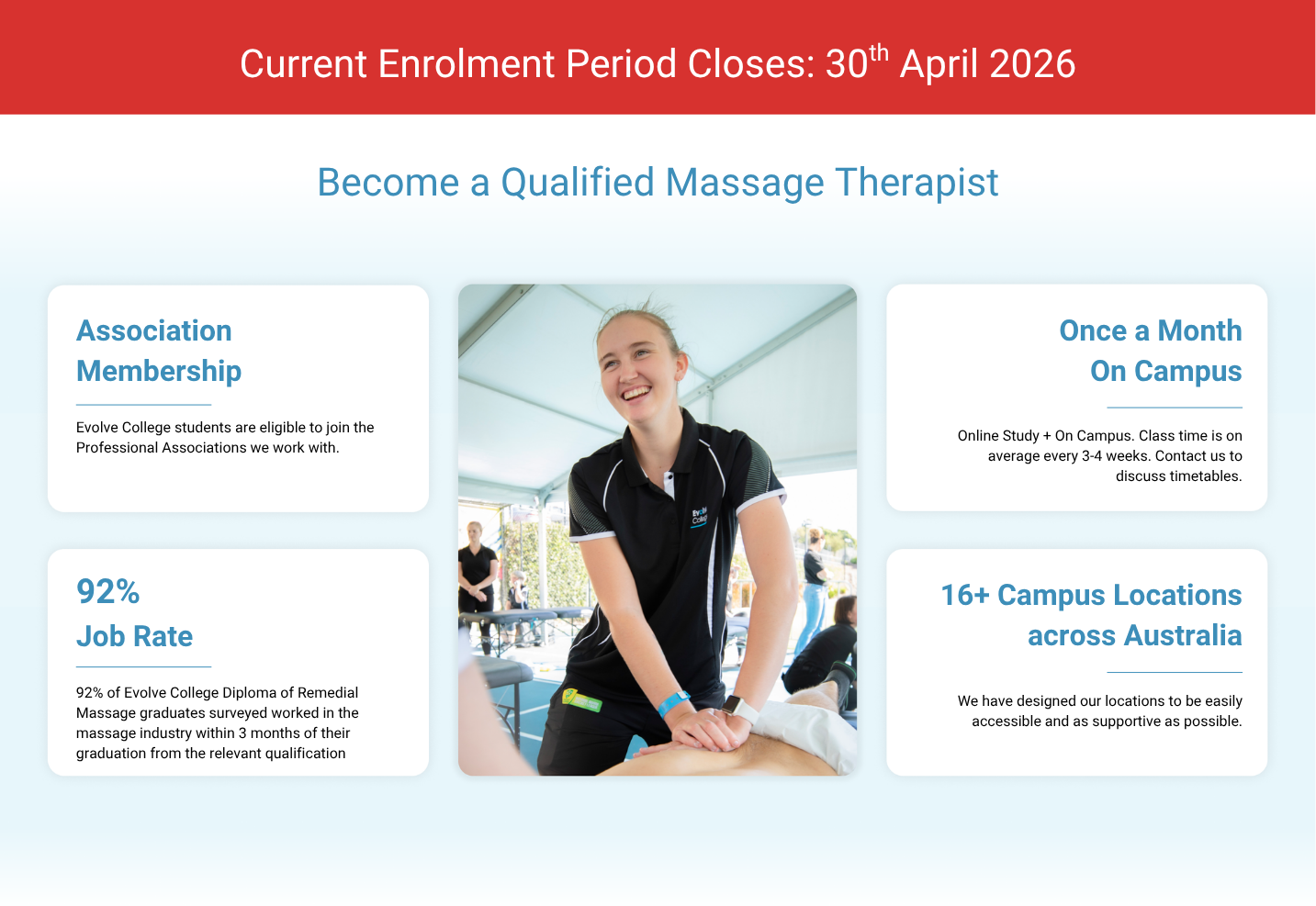 Being the largest private provider of massage education in Australia, Evolve College is a focused leader in the massage industry that educates with a commitment to ethical clinical practices and preparation for remedial massage services.