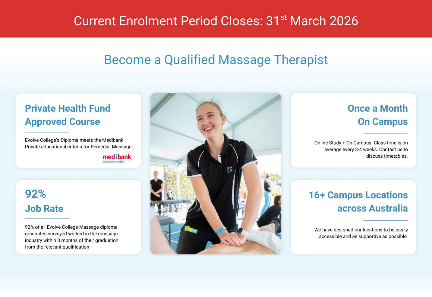Being the largest private provider of massage education in Australia, Evolve College is a focused leader in the massage industry that educates with a commitment to ethical clinical practices and preparation for remedial massage services.