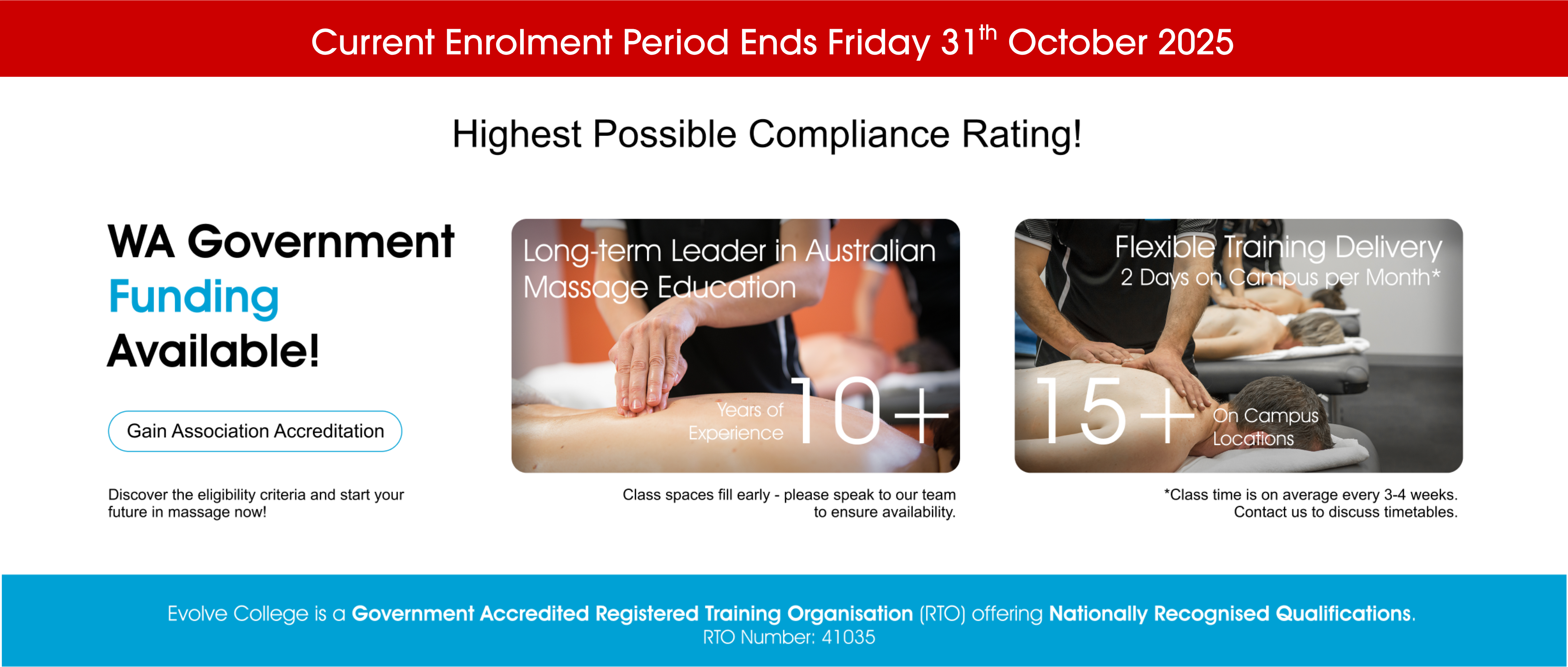 Eligible Western Australian residents may enrol into the HLT52021 Diploma of Remedial Massage course through the Lower Fees, Local Skills program. This program is run through the Western Australia Government. Evolve College is approved to offer funding available under the Priority Industry Training Program to existing workers residing in Western Australia.